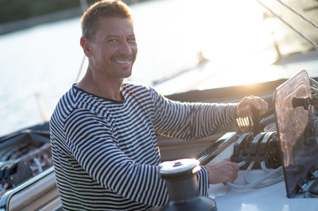 Mature man captain on the deck of a sailing yacht at sunset