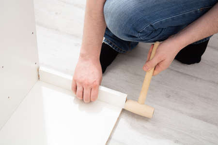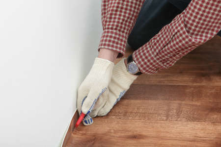 Man installing plinth on laminated floor in room, closeup