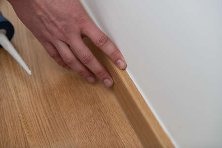 Worker's hands Instal plastic skirting board on laminate flooring. Renovation of baseboard at home.