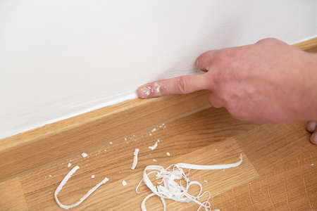 Man putting new skirting board or floor baseboard on wall in house.