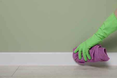 Woman in protective glove cleaning plinth with washcloth indoors, closeup. Space for text