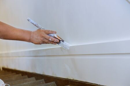 Painting of wooden molding fstairs flooring rame workers hand and brush