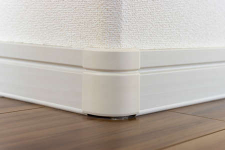 Laminate with plastic baseboard with a wooden texture. Newly installed wooden laminate flooring and baseboards in home. Modern design. Close up of plastic plinths on dark wooden oak floor parquet.