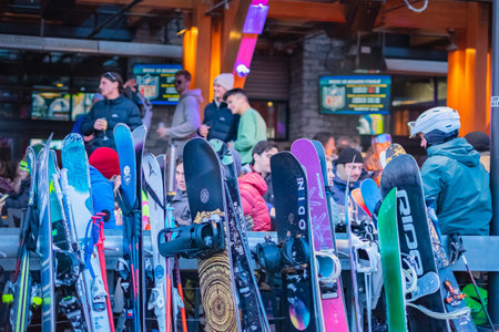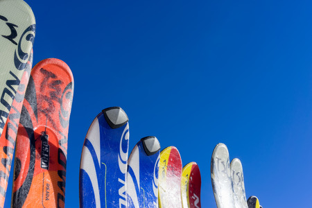 Sport background. Winter sport. Snowboards in snow at ski resort Whistler BC Canada-January 1,2022-Travel phot, street view, blured background, editorial