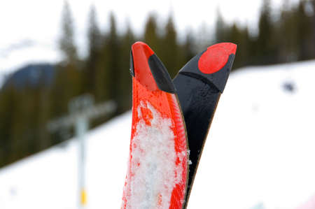 Tips of red snow skis at ski resort with mountain in the background