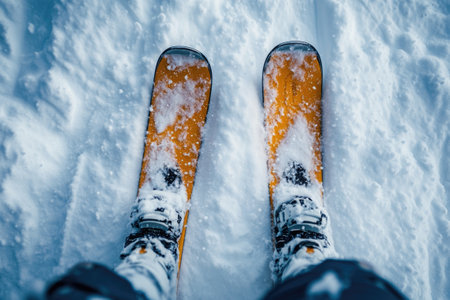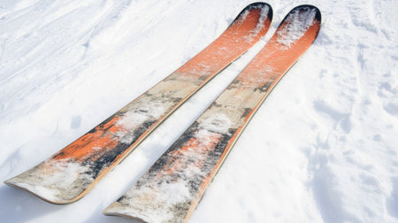 A pair of long, vibrant orange and black alpine skis sit elegantly on a pristine snowy backdrop, inviting winter sports enthusiasts to embrace the thrill of skiing in the mountains.