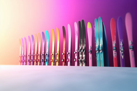 A vibrant collection of colorful skis arranged neatly against a snowy backdrop, showcasing wintertime excitement and outdoor adventure perfect for ski enthusiasts.