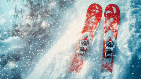 Skis rest in freshly fallen snow as snowflakes drift gently in the chilly air. The vibrant red color of the skis contrasts beautifully with the white snow, creating a serene winter atmosphere.