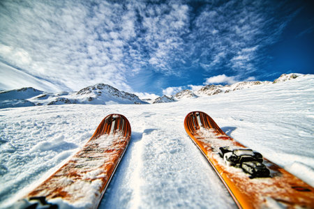 Pair of Skis on Snowy Mountain Slope with Alpine Background
