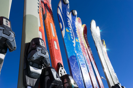 Photo of multi-colored skis in snow at winter resort