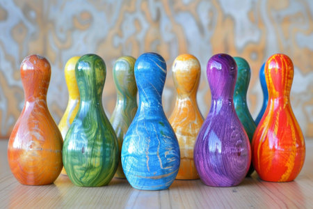 Vibrant array of painted wooden bowling pins arranged on a wooden surface with a patterned backdrop