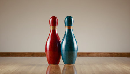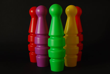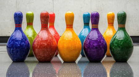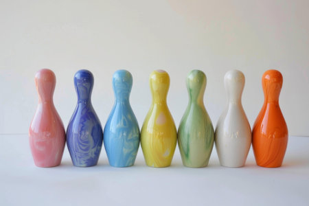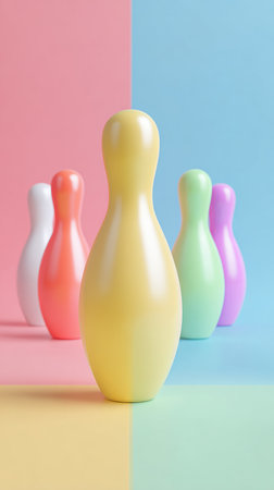 A vibrant image of bowling pins in various colors against a pastel backdrop, perfect for sports and leisure themes.