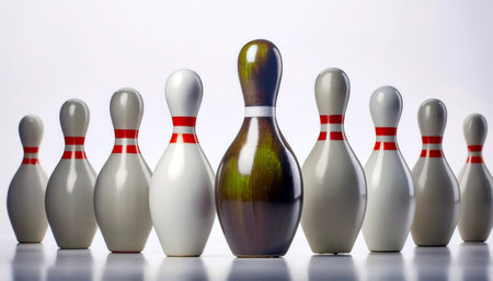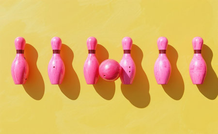 Bowling pins with one pink pin stand out against a bright yellow background, creating a vibrant and playful composition that symbolizes uniqueness and individuality in sports