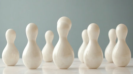 A serene still life featuring elegant white bowling pins arranged strategically on a smooth surface, showcasing minimalistic design and soothing aesthetics.