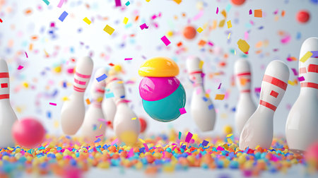 This vibrant bowling scene captures energetic fun with colorful balls and playful confetti. It showcases an exciting atmosphere for celebrations and events.