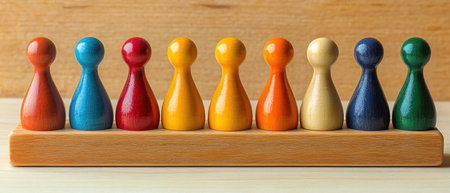 Colorful game pieces in rows on light wood surface, community concept, bright and minimal composition