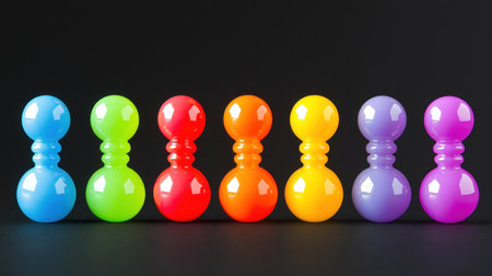 Selection of brightly colored wooden pawns lined up in a row, with a focus on the front pieces