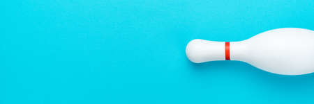 Flat lay top down image of white bowling pin with copy space. Minimalist photo of bowling pin over turquoise blue background.