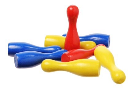 Colorful wooden bowling pin on white surface, minimalist composition. Toy design and simplicity concept