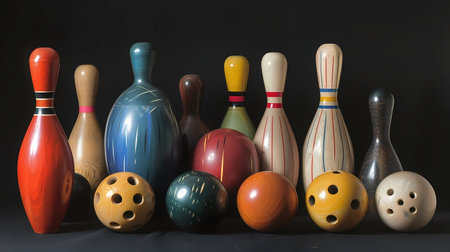 Bowling pins and bowls on a black background, Generative AI illustrations.