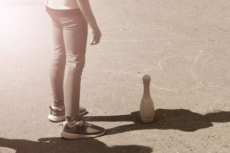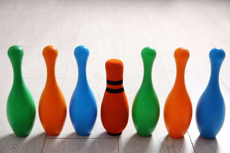 Fabric bowling pin among others on wooden floor. Diversity concept