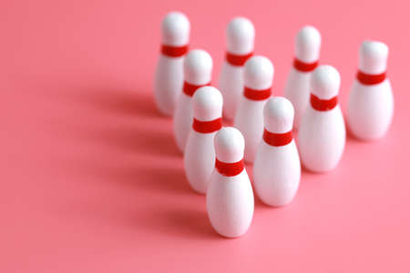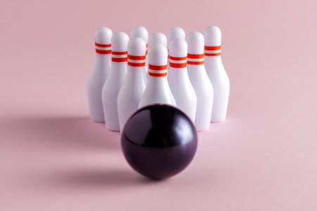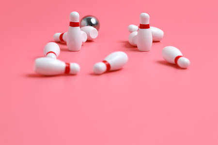 Bowling ball and white skittles on pastel pink background. Minimal creative concept.