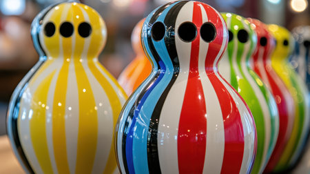 A charming display of colorful bowling pins arranged in a row, featuring striking patterns and hues, ideal for any bowling-themed project or visual representation.