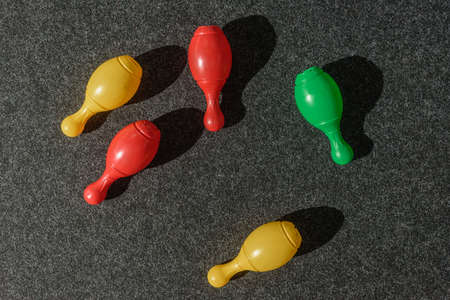 Three yellow bowling pins on colorful background. Minimalistic style.