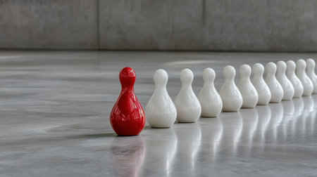 A striking image of a single bowling pin featuring a vibrant red top, expertly captured on a sleek reflective surface against a dark backdrop. Ideal for sports themes.