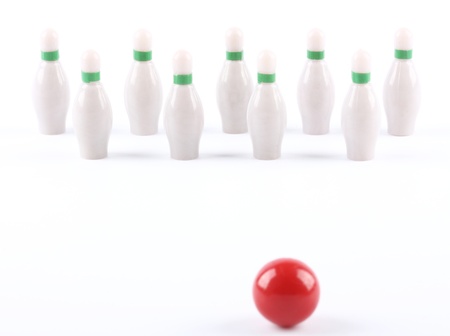 A row of white and red bowling pins with a red one in the middle. The red one is the only one that is not white