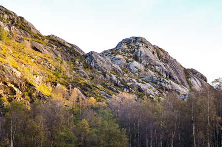 tree with orange on the background of the Norwegian mountains, green forests and the sky with clouds