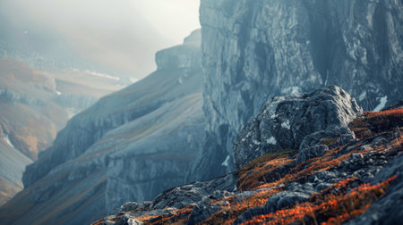 A distant defocused landscape of rugged slopes and jagged cliffs evoking a sense of ancient mysticism and wonder.
