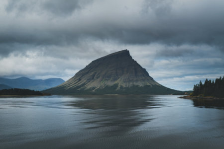 mountain lakes and mountains are captured in this drone photo, with heavy clouds adding to the atmospheric ambience. the style of erik johansson and carl holsoe is evident, reminiscent of traditional british landscapes. the use of light gray and amber tones creates a thought-provoking scene, akin to the work of philip mckay. ai generated