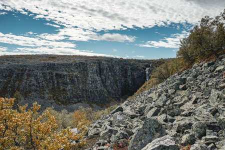Swedish autumn fall vibrant landscape during hiking to Kurravaara mountain in Norrbotten county, Kiruna Municipality, Northern Sweden