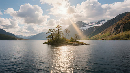 A small island in the middle of a lake surrounded by mountains under the sunlight