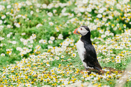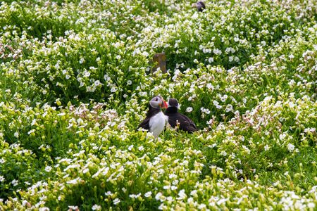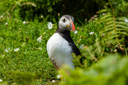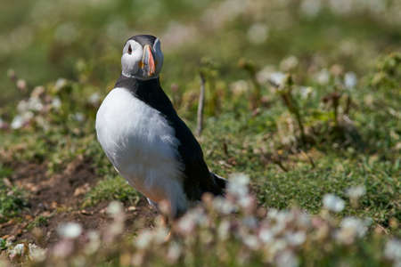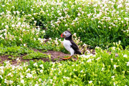Atlantic puffin (Fratercula arctica) amongst summer flowers on Skomer Island off the coast of Pembrokeshire in Wales, United Kingdom