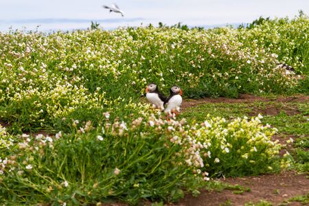 Couple puffins with flowers on the cliff near coastline