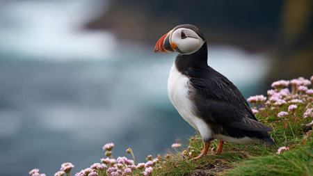 Colorful puffin perched among flowers on a coastal cliff during a sunny day