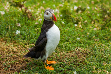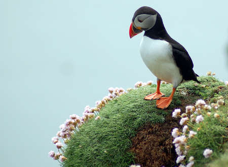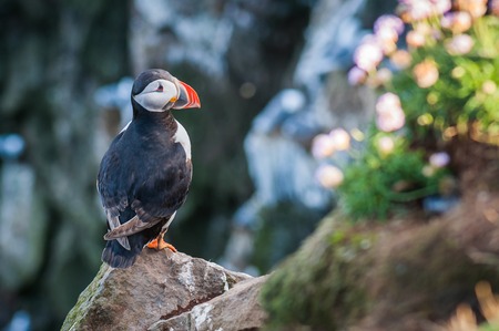 Puffin with distinctive black, white, and orange feathers stands on grassy cliff with pink flowers