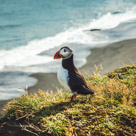 Close up of a puffin on the seashore in Iceland.