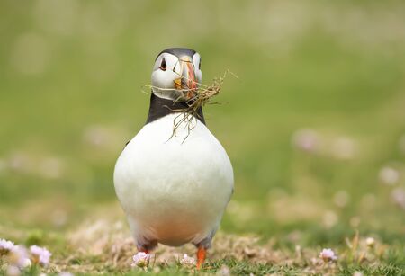 Close up of Atlantic puffin with nesting material in the beak, Shetland Islands, Scotland.