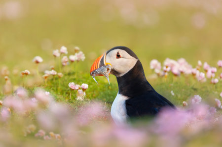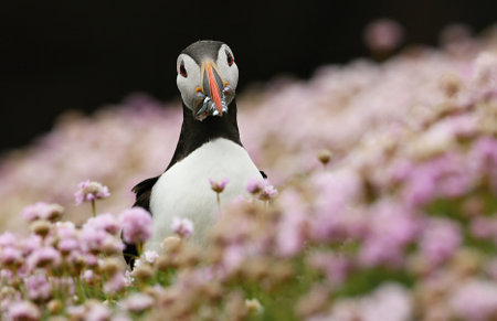 Close up of Atlantic puffin with sand eels in pink sea thrift flowers on a coastal area of Scotland, UK