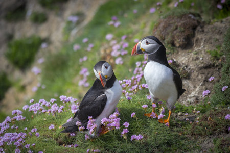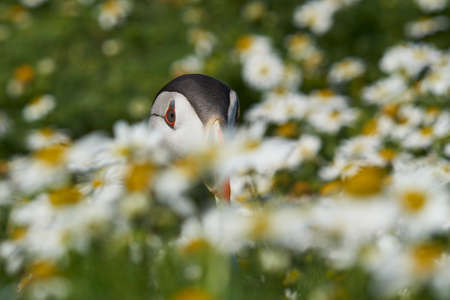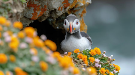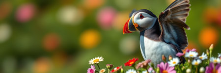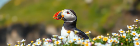 Puffin perched among vibrant flowers in a lush meadow during spring season