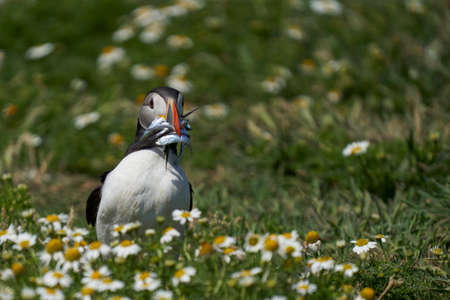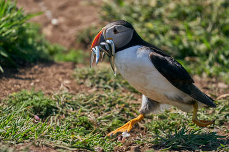 Puffin with sandeels walking in the flowers on Skomer Island.