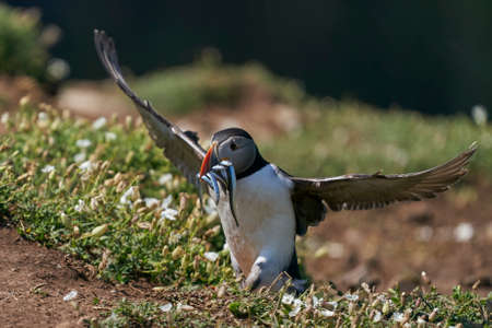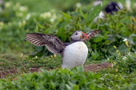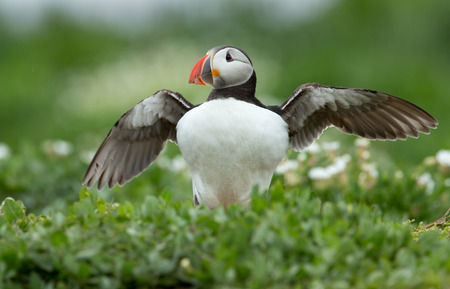 A Fratercula Arctica, commonly known as a puffin, with spead wings, on Skomer Island