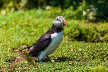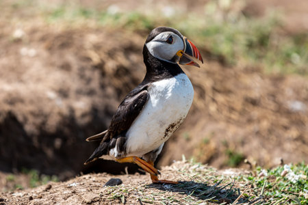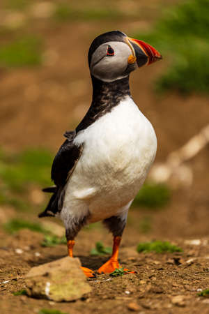 Cute, colorful Puffin (Fratercula arctica) standing next to its burrow during the breeding season (Skomer, Wales, UK)