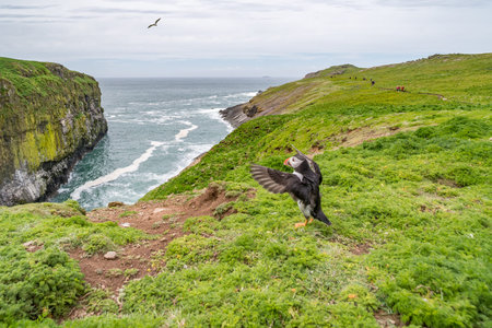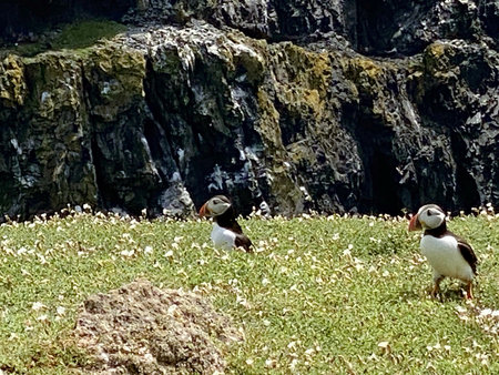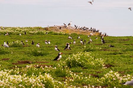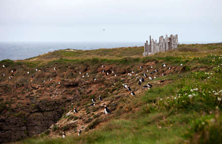 Landscape of puffins nesting on grassy cliffs in Grimsey Island