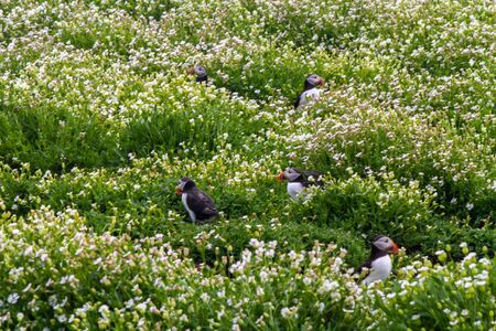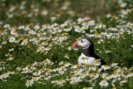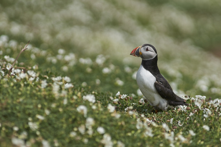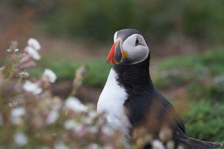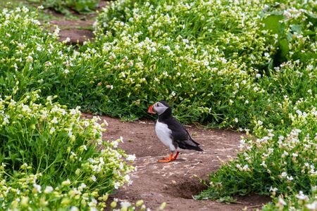 Atlantic puffin (Fratercula arctica) amongst summer flowers on Skomer Island off the coast of Pembrokeshire in Wales, United Kingdom