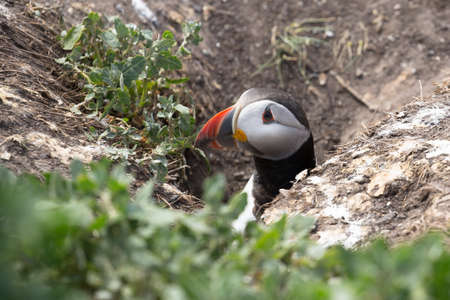 Cute, colorful Puffin (Fratercula arctica) standing next to its burrow during the breeding season (Skomer, Wales, UK)