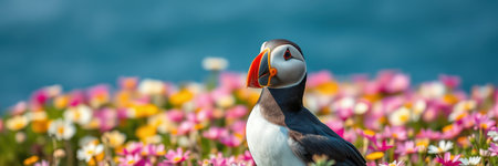 Atlantic puffin, fratercula arctica, sitting on a rocky cliff in summer. Black and white sea bird with colorful beak in horizontal composition with purple flowers.